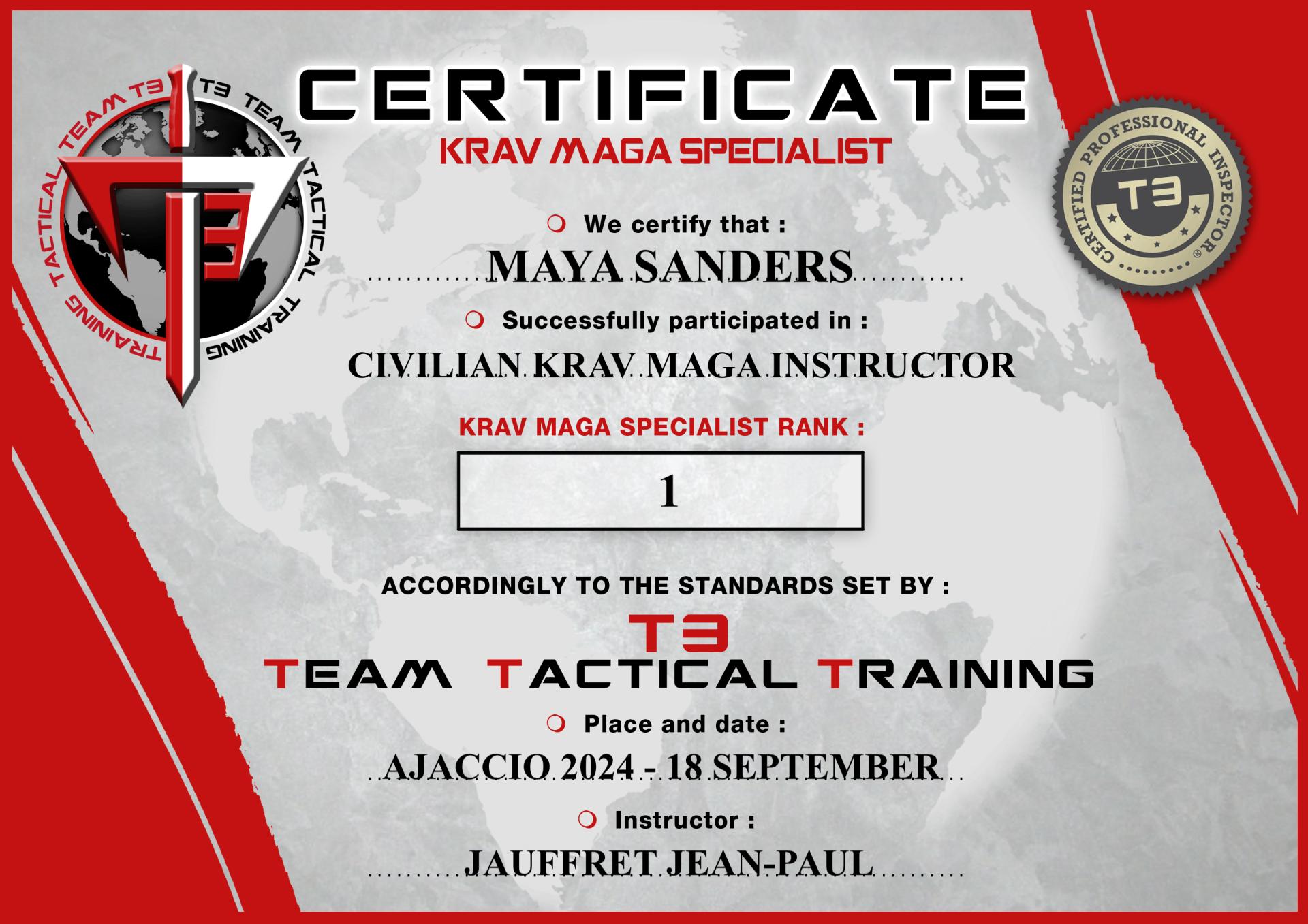 Maya, ancienne avocate et juriste, travaille aujourd'hui dans le domaine de la formation professionnelle. Elle pratique le Krav Maga depuis 2016 et a obtenu le niveau Gradé 1 (G1) ainsi que son certificat d'instructeur civil, qui correspond au niveau Specialist 1 (S1) chez T3.